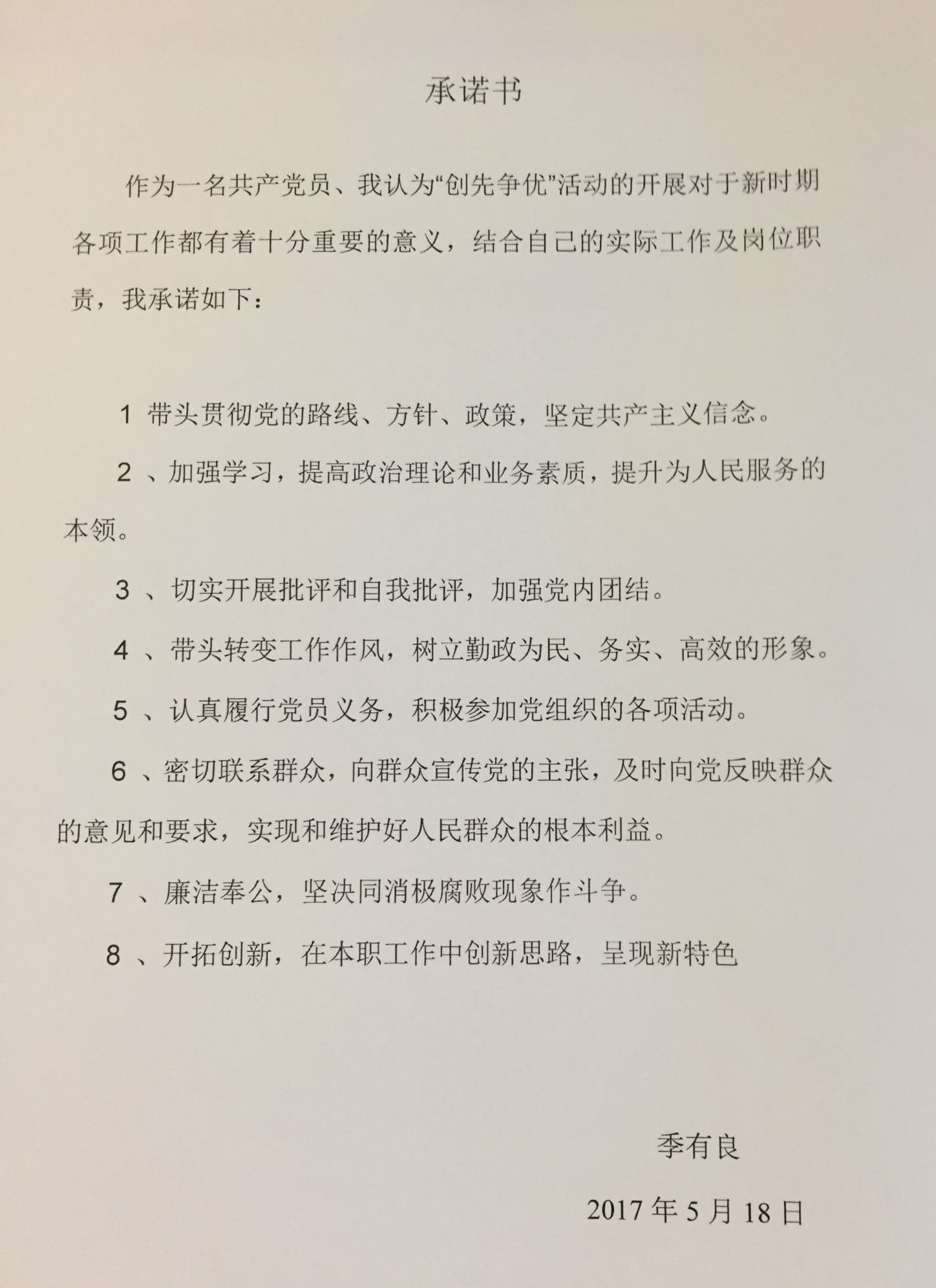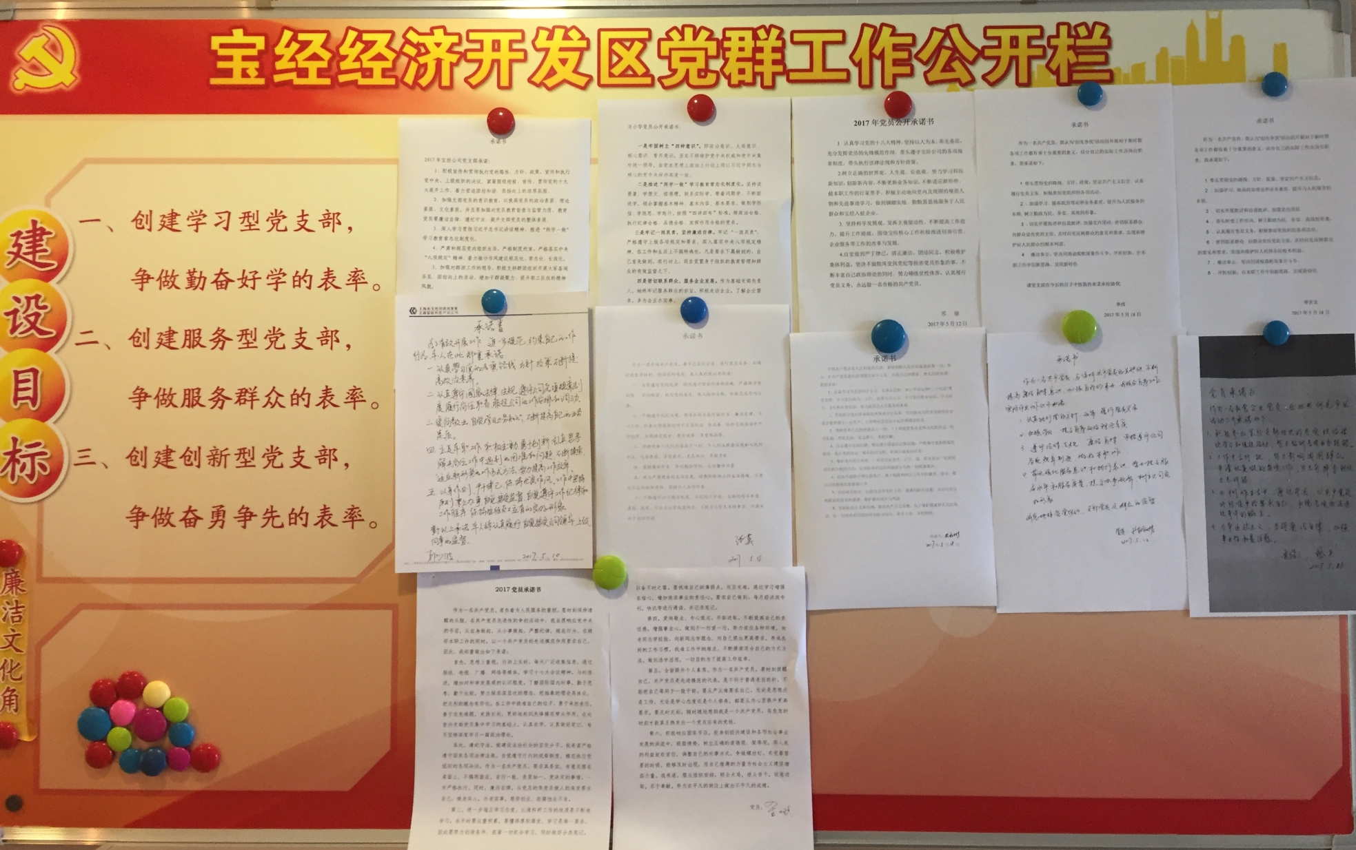 为深入贯彻党的十八大和十八届三中、四中、五中、六中全会精神,同时迎接十九大召开,近期,宝经党支部开展了党员公开承诺活动,得到支部党员同志们的积极响应,大家结合自身实际工作情况作公开承诺,并在支部网站和支部公开栏进行公示。